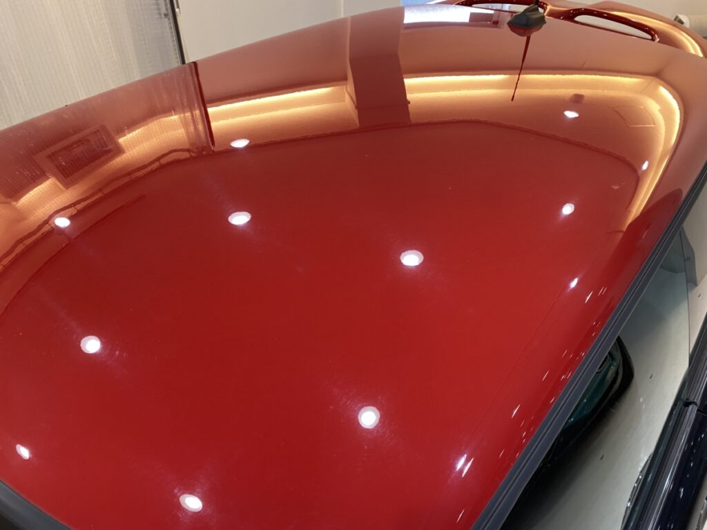 特に上面部分は、雨染みと傷で艶がひけている状態でした。磨きでしっかり除去しています。