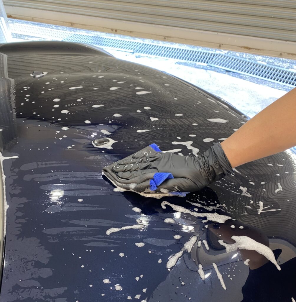 まずは下地処理、鉄粉除去をしてマスキングしていきます。今回の車両は鉄粉とボディの付着物が多々見受けられたので、下地処理の段階ですべて除去しています。